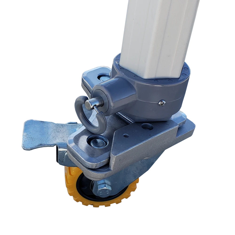 Super Heavy Duty MegaX – The ultimate in strength. Steel truss system with aluminum legs. Extra head clearance. Wheel bases attach to footpads for easy maneuverability.