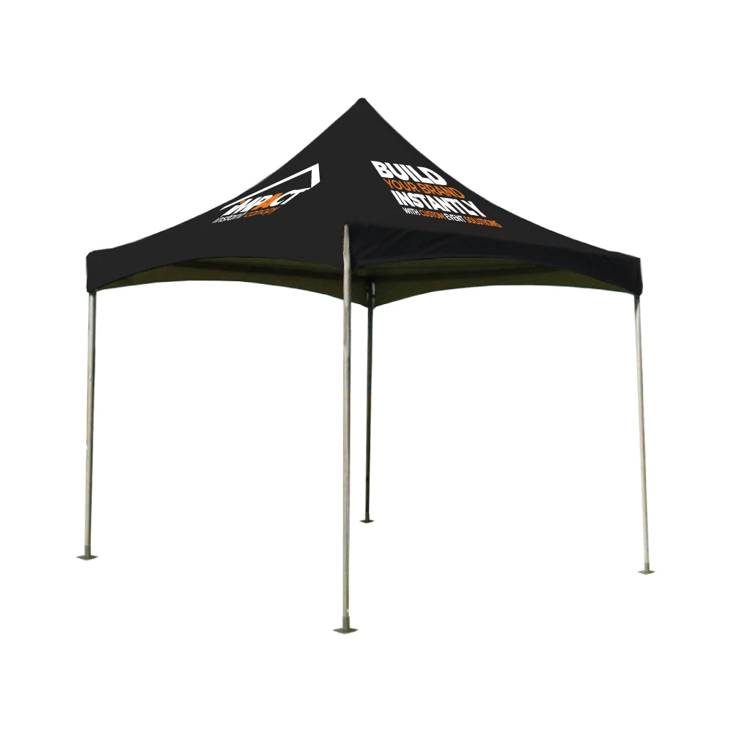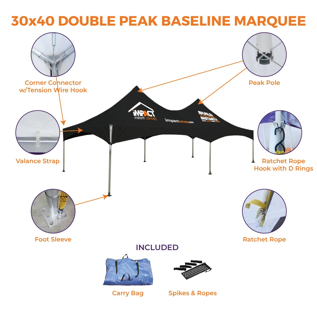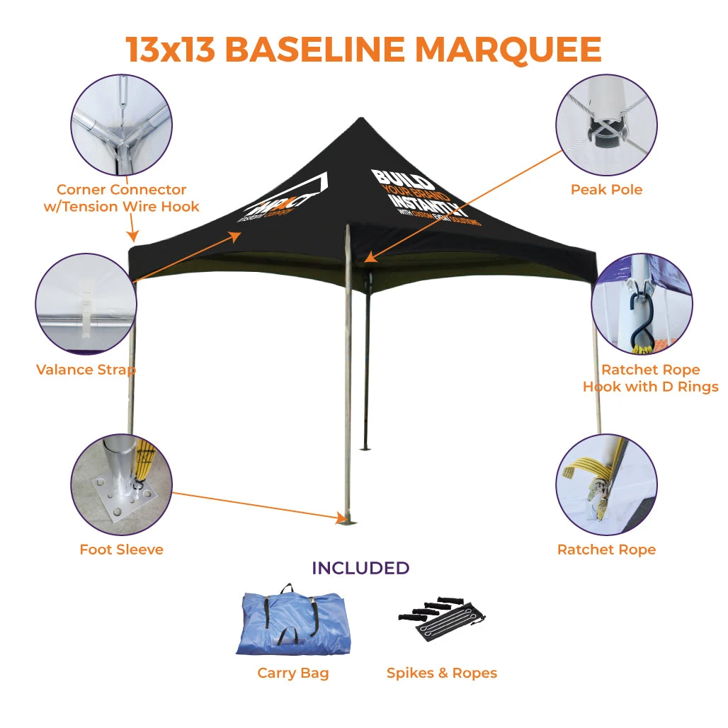 The Baseline Marquee is fully customizable. Comes in a variety of sizes, single and double peaks. The top is made of PVC Vinyl which can be digitally printed with your marketing message.
