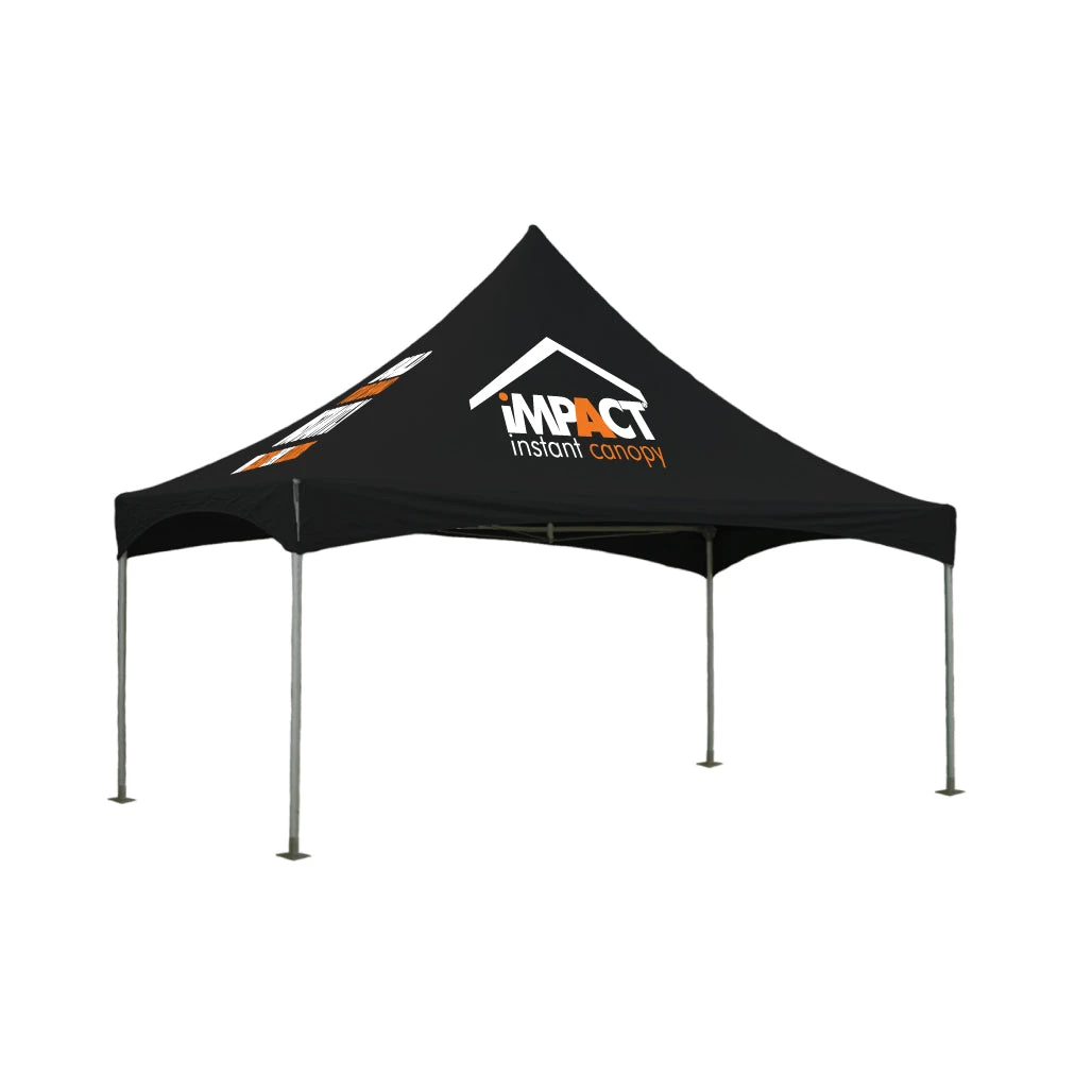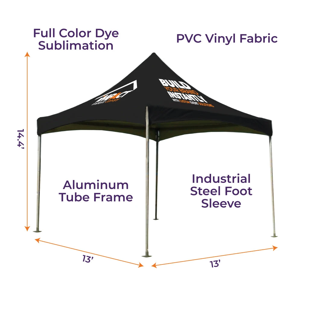 Our Baseline Marquee is constructed with heavy duty 2.5” aluminum tubing with extended sleeves on the footpads for extra reinforcement. The frame uses a tension wire system to support the roof and increase the strength and stability of the canopy. The top is made from Fire Retardant PVC Vinyl which can be digitally printed with full color graphics. Also available in 10 different stock colors for unprinted shelters.