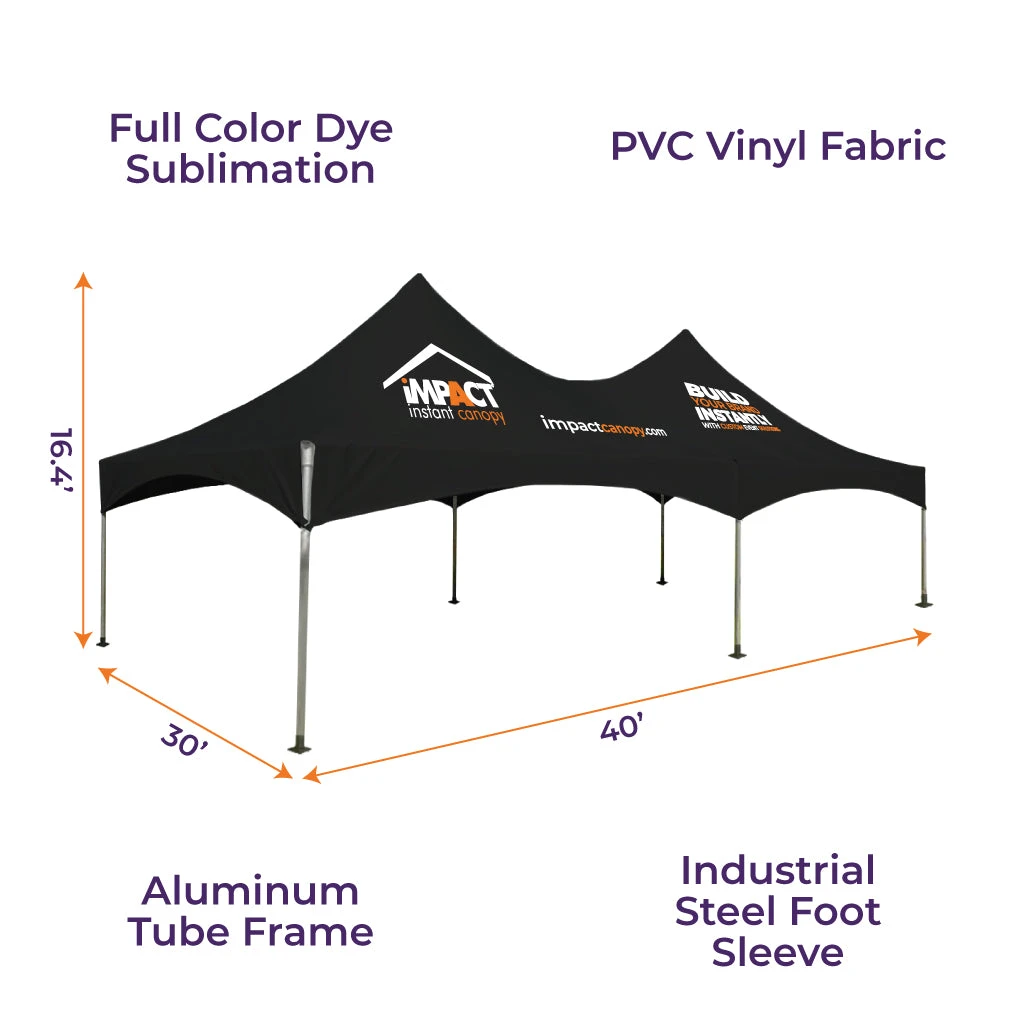 Available in eight sizes: 10×10, 16×16, 13×26, 10×20, 20×20, 10×20 double peak, 20×30 double peak, 20×40 double peak.