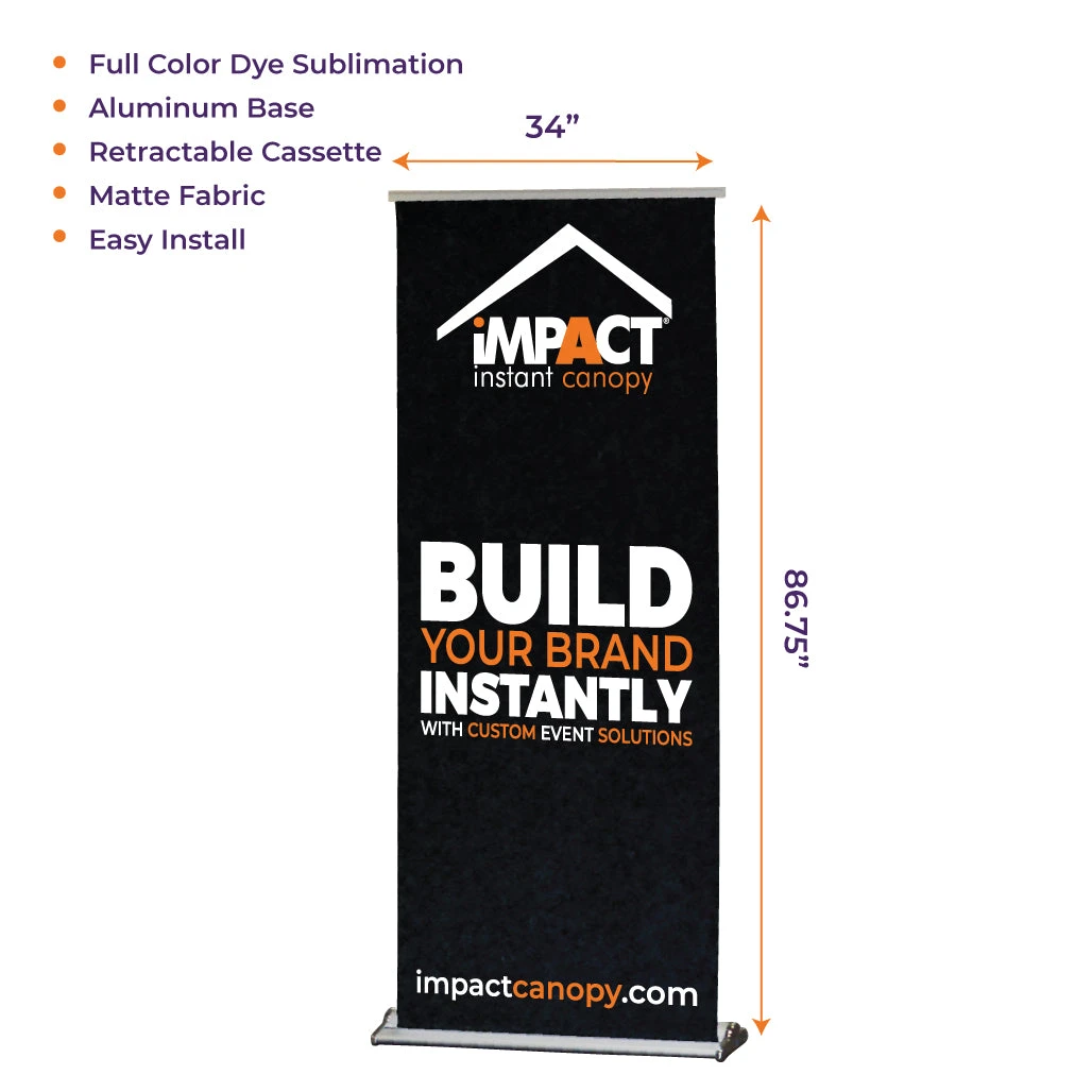 Designed to make a big impression at a moments notice, the Deluxe Roll-Up Banner attracts prospects in seconds. Attractive, smart and affordable, the Deluxe Roll-up Banner takes the fuss out of the preparation and delivery of your high impact message. Using a finely engineered removable spring loaded roll up cartridge locked in the banner base, the Deluxe Roll-up Banner stores and protects your banner when not in use – and goes up instantly when it is. Ideal in free-standing open areas like malls, showrooms, and trade shows.