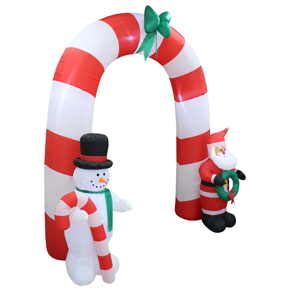 Add a little Christmas magic to your yard or home with this big inflatable arch featuring frosty the snowman and Santa. This item features Santa with a wreath, and Frosty the Snowman with his candy cane. Set up is quick and easy: just plug it in with the included adapter and your decoration will be fully inflated in minutes.
